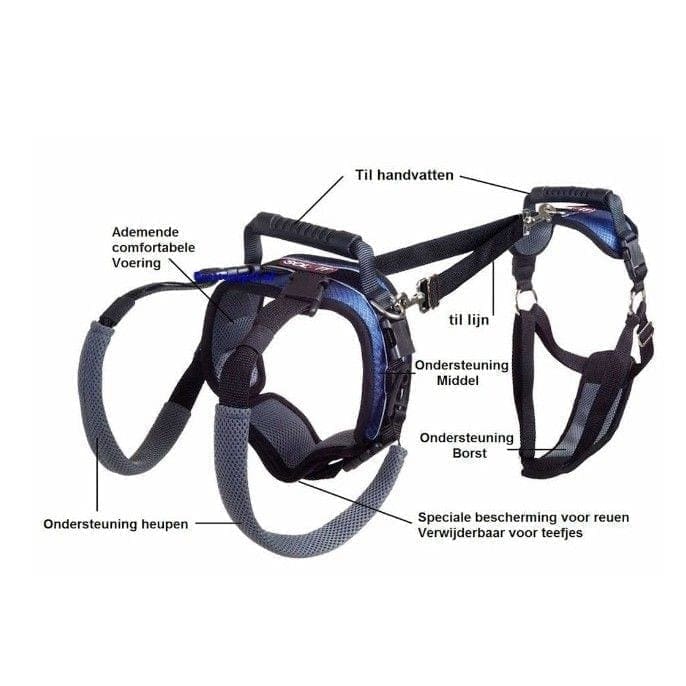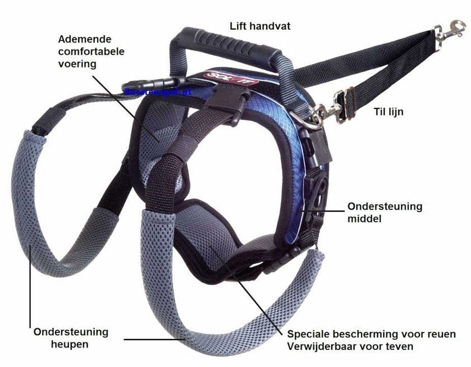 Het unieke ontwerp van het achterste gedeelte, ondersteund de hond vanaf beide heupen en buik, wat minder stress veroorzaakt.