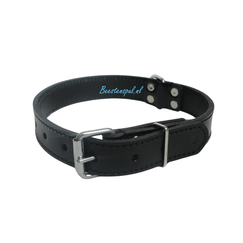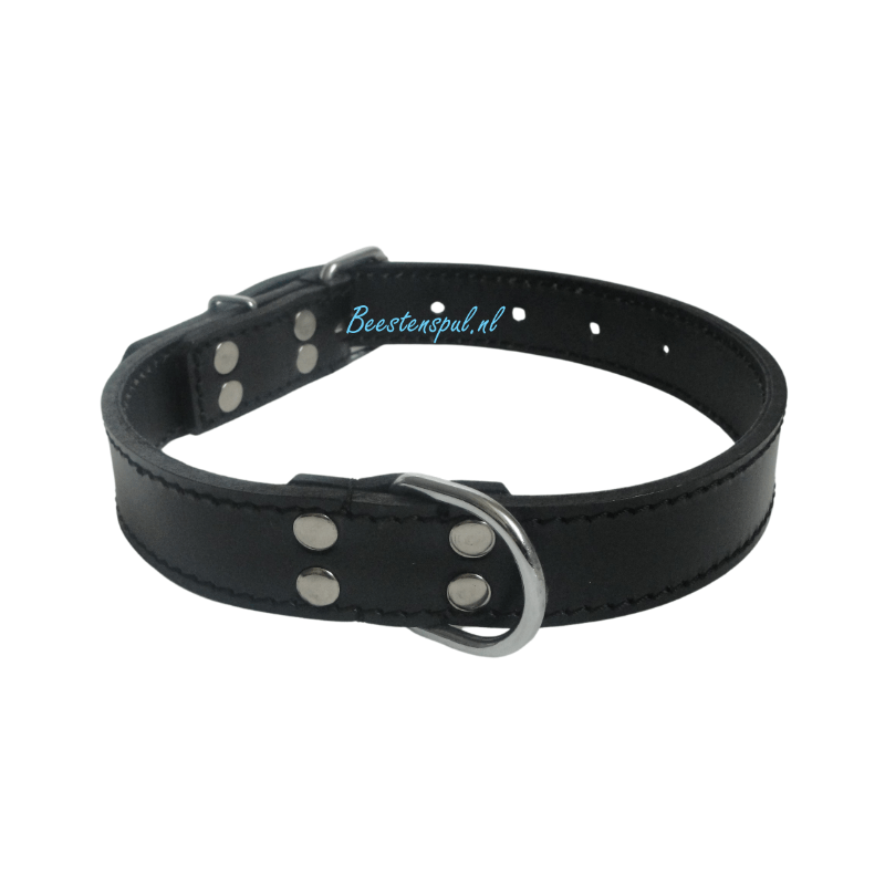Degelijke halsband met een D-ring bij de gesp en afgewerkt met chroom.