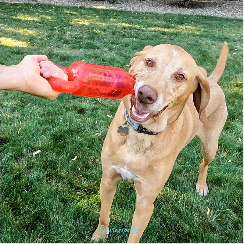 De Kong Jumbler met rollende tennisbal aan de binnenkant en luide piep zorgt voor veel trek- en apporteerplezier.