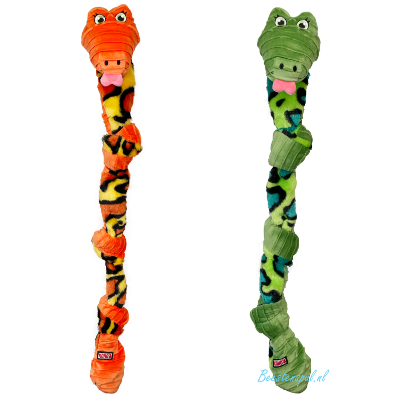 Kong Knots Snake is zacht van buiten en sterk van binnen, dankzij een inwendig geknoopt touw dat de natuurlijke instincten van honden bevredigt. Deze lange, slappe vriend is ideaal om mee te schudden, trekken en gooien, met piepers binnenin voor extra lang speelplezier.
