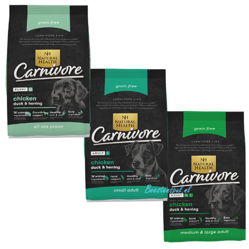 Natural Health Carnivore heeft een laag percentage zetmeel, een hoog percentage eiwit en is vrij van granen.