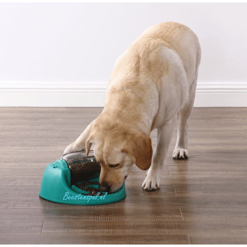 Tip: als uw hond het spel eenmaal onder de knie heeft, kunt u één uitgang afplakken zodat de brokjes er lastiger uitkomen.