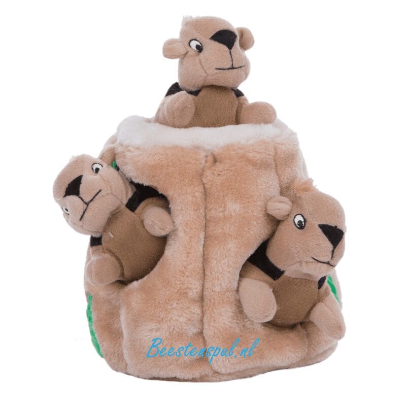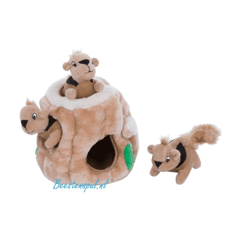 Leuk zoekspel in de vorm van een boomstam waarin 3 eekhoorntjes met pieper verstopt zijn.